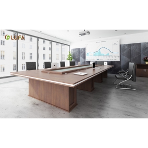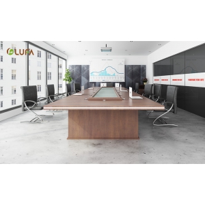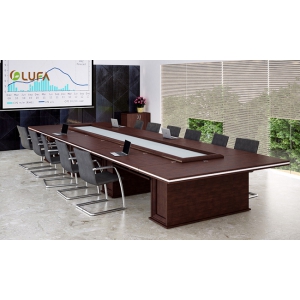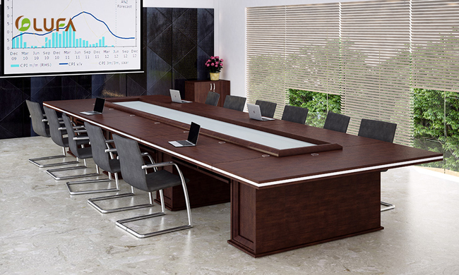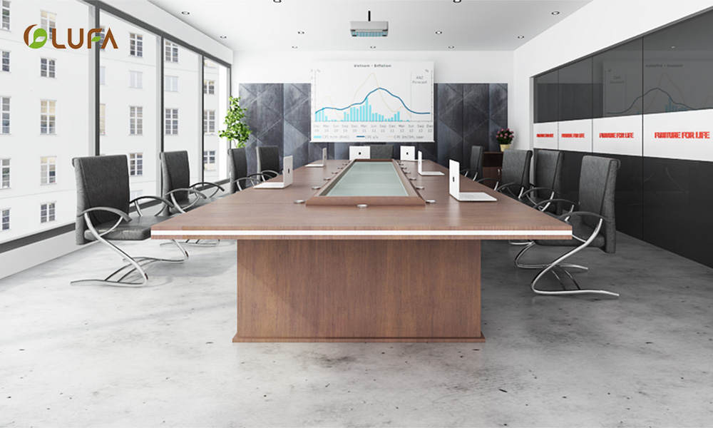 - Bàn được trang trí đẹp mắt, các đường nét tinh tế, màu sắc sang trọng tạo nên sự trang trọng cho phòng họp.